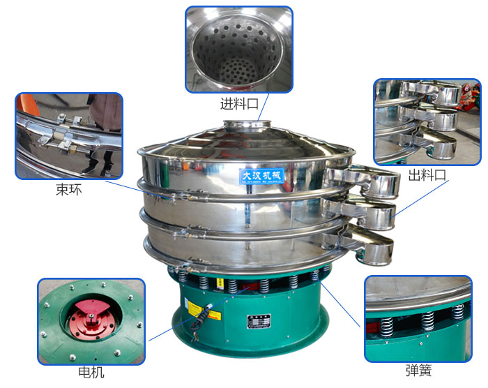 旋振篩主要由進(jìn)料口、防塵蓋、出料口、束環(huán)、篩網(wǎng)、配重塊、上部重錘、振動體、振動電機(jī)、彈簧、下部重錘、機(jī)座等部分組成。