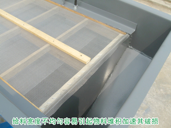 在直線振動篩的篩分過程中,振動篩面的寬度決定其處理能力,長度決定其篩分效果,如果在對振動篩的給料過程中,給料量過大使設備無法對其進行篩分,或給料寬度不均勻,引起物料堆積,都容易也使得篩網(wǎng)受力不均,加速其破損的情況。